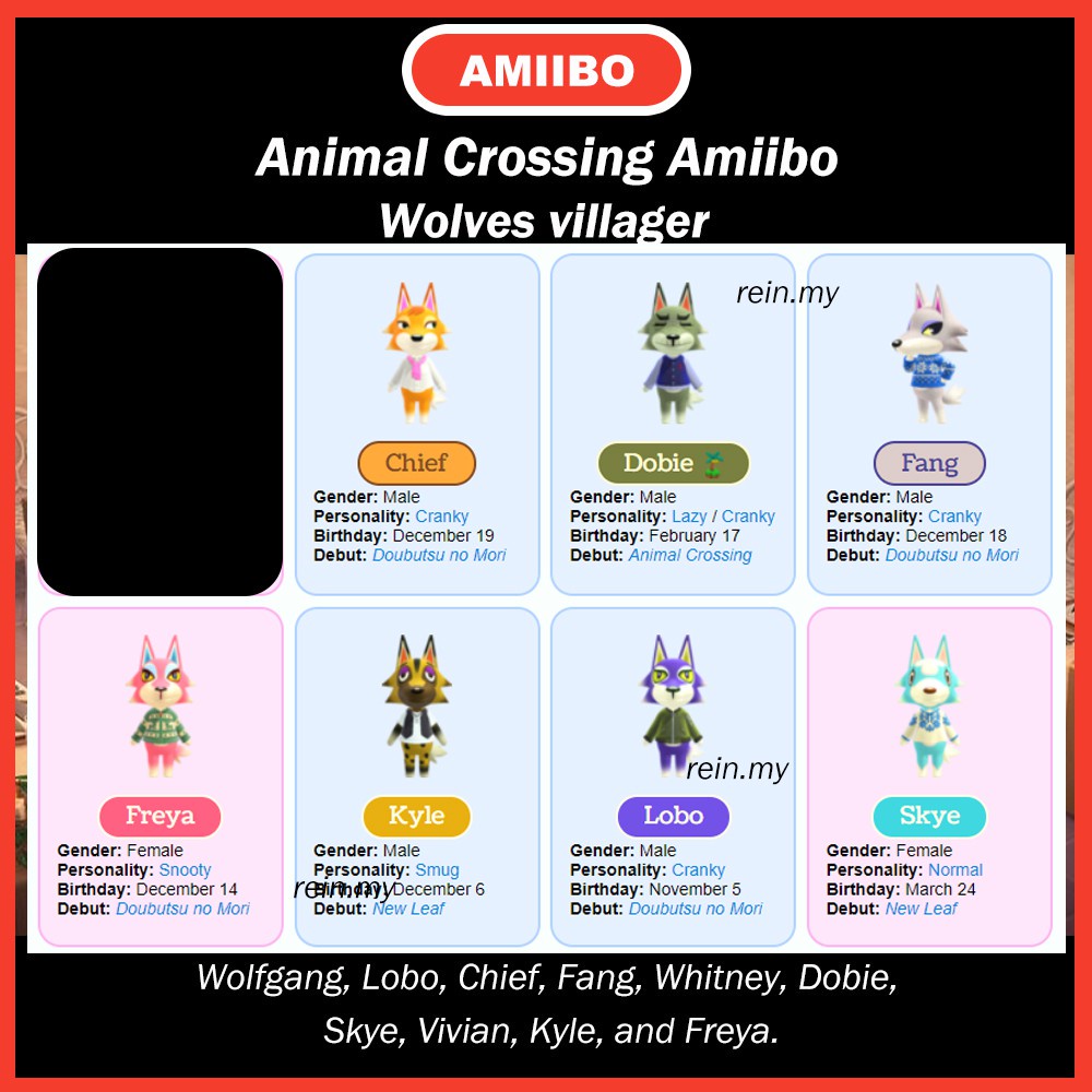 Animal Crossing Amiibo Wolve Wolfgang Lobo Chief Fang Whitney Dobie Skye Vivian Kyle Freya Shopee Singapore